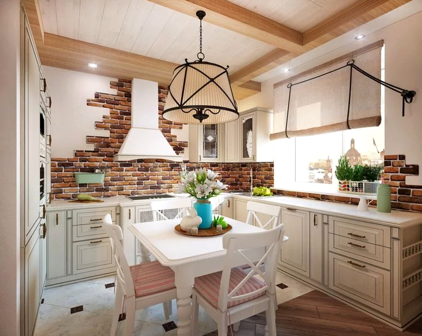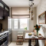 The main light in the kitchen is provided by a central chandelier in a single copy, which is typical for a small kitchen, or several products of the same type. The work area is illuminated using bright light sources, which should be located above the table top.