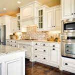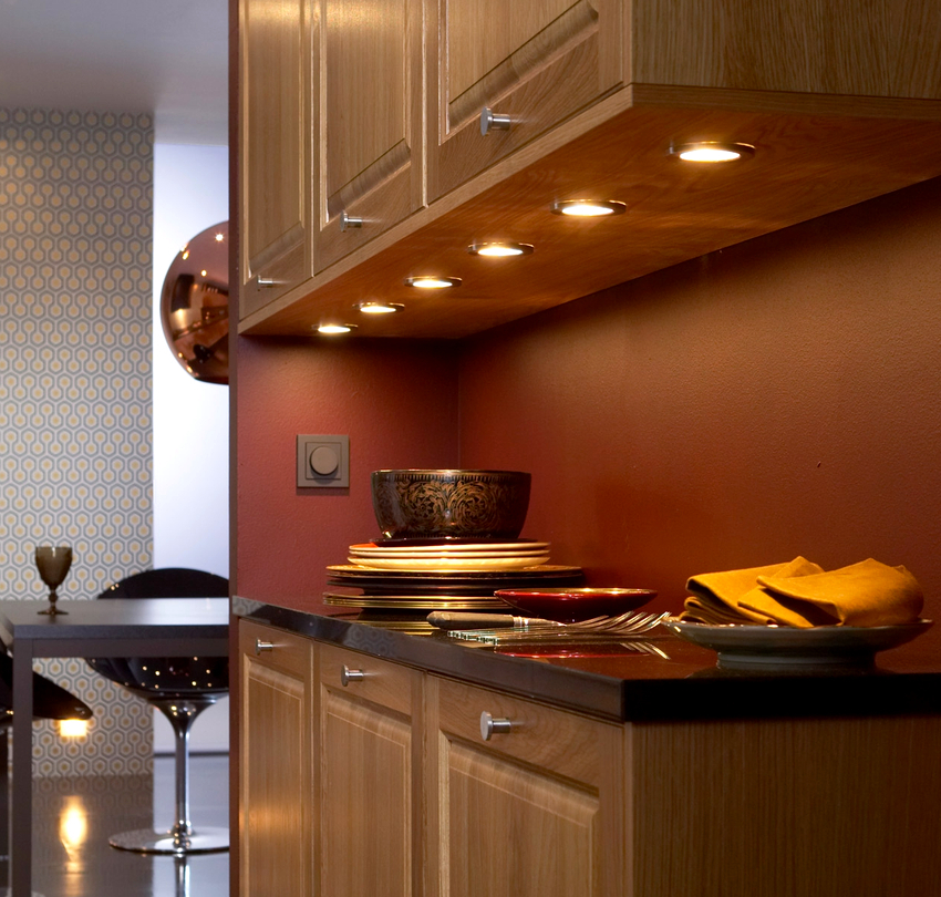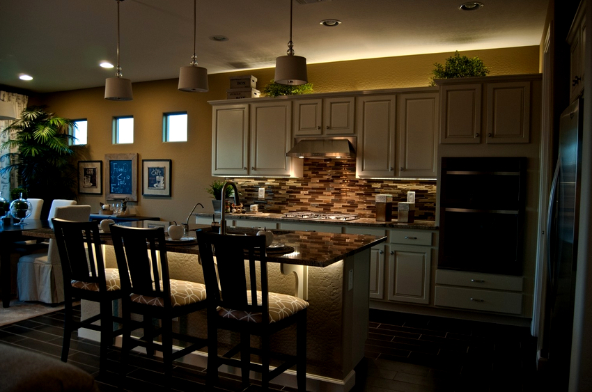If the hanging cabinets are equipped with a cornice, then this is the most suitable place for the location of spotlights. Kitchen furniture lamps in the form of LED lighting can be installed inside cabinets with transparent doors. It will work when the doors are opened.