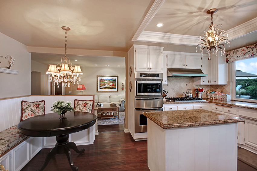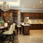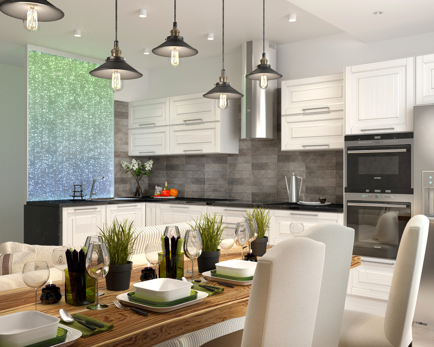 A chandelier, wall sconces and ceiling lamps can be used to illuminate the dining table. An important role in the kitchen is played by decorative lighting, which is mounted inside cabinets, along the ceiling, plinth, bottom and top of the kitchen unit.