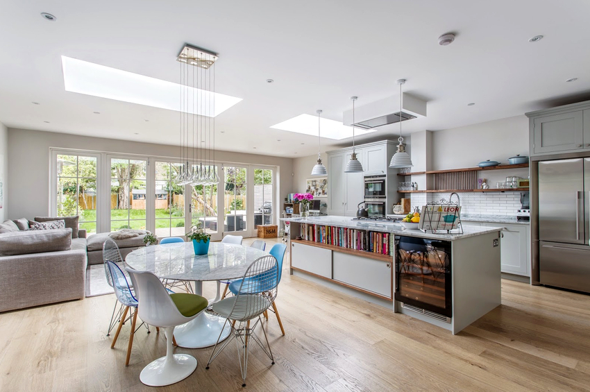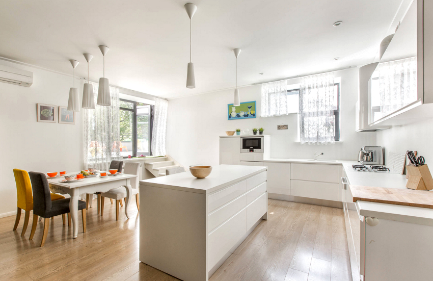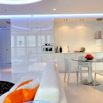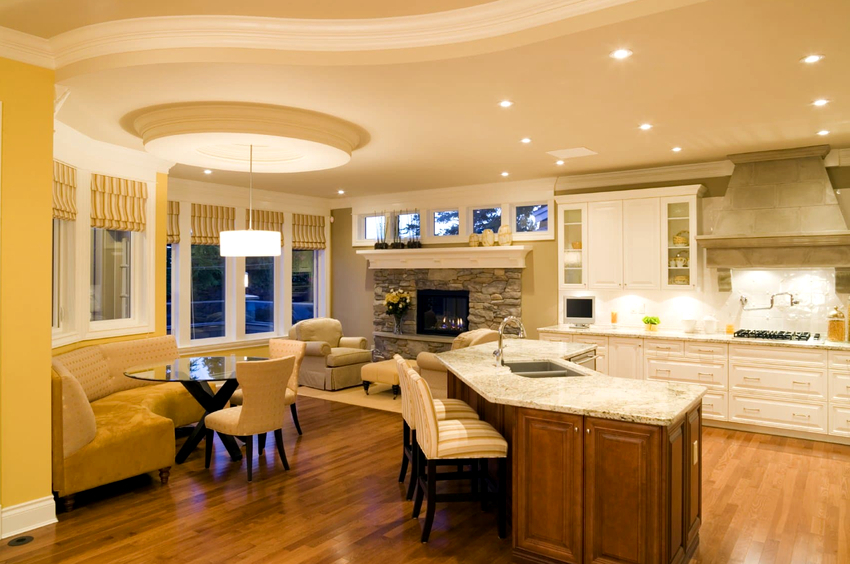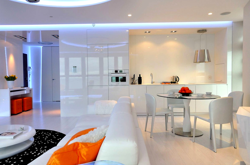 In the kitchen-living room, it is important to organize lighting of different intensities.This is due to the fact that in this room there is a rest corner, a place for receiving guests and a work area. In the kitchen and dining space, a bright base light is set up for each place separately. It can be adjusted according to the light level.