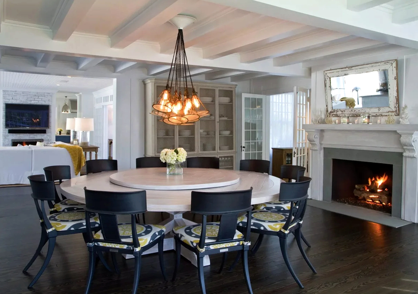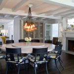 The most popular solution is to use a large pendant or ceiling chandelier above the center of the table. It is equipped with a beautiful translucent glass shade or transparent plastic shade. The design of the chandelier is selected based on the condition that the plafond should be at least 1.2 m from the table surface. The best options for lamps above the table are models in the form of a ball, cone, rectangle or semicircle.