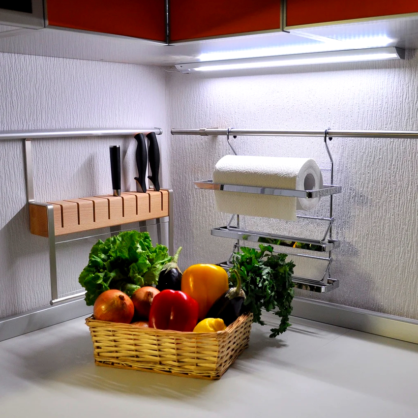 The bar can serve as a shelf for various kitchen items. The best way is also to organize a double bottom in cabinets, where it is easy to hide the backlight. Frosted glass can be installed here, providing soft diffused light.