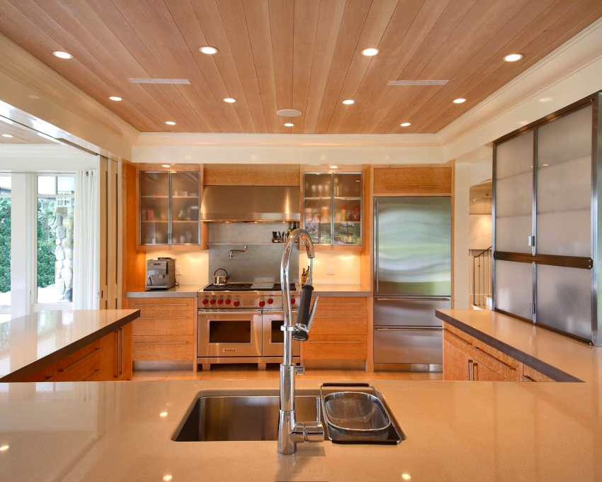 In a spacious room, general lighting can be organized by spotlights, which can be equidistant from each other along the entire ceiling or along its perimeter, creating a light ornament on the surface. This option is used for stretch or plasterboard ceilings. Spotlights in the kitchen visually raise the level of the ceiling, making the room more spacious.