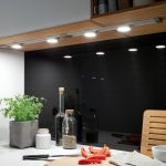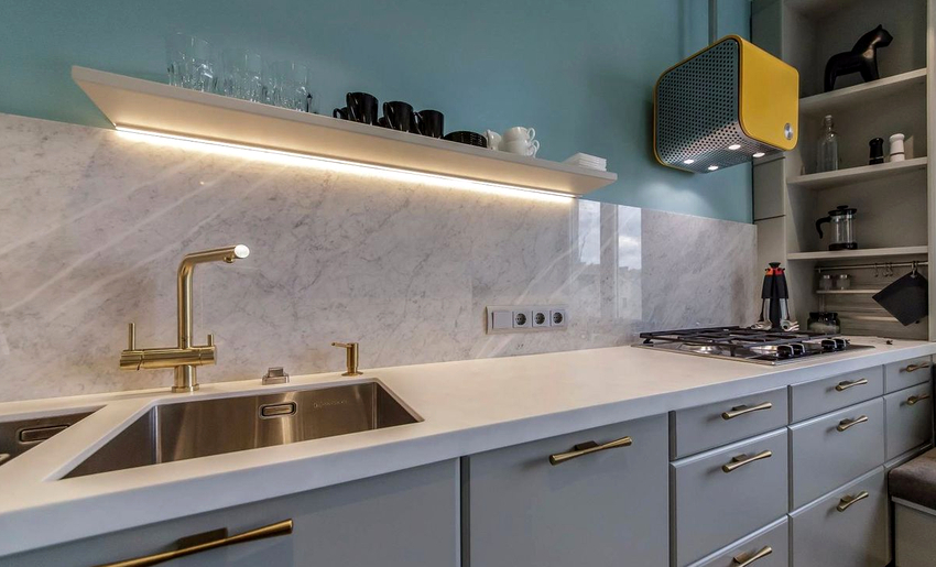 There are several options for organizing lighting above the work surface in the kitchen: spotlights, fluorescent lamps and LED strips