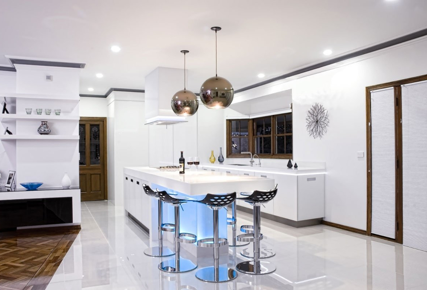On the other hand, neutral white light promotes physical activity, improves tone and energizes. It is best suited for a workplace or fast food area. Cold white with a blue tint quickly tires. It is recommended to use it as a decorative lighting in the kitchen to create light boundaries for the zoning of the territory in the case of combining rooms.