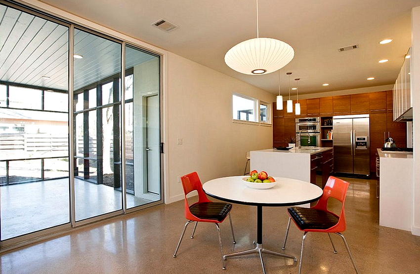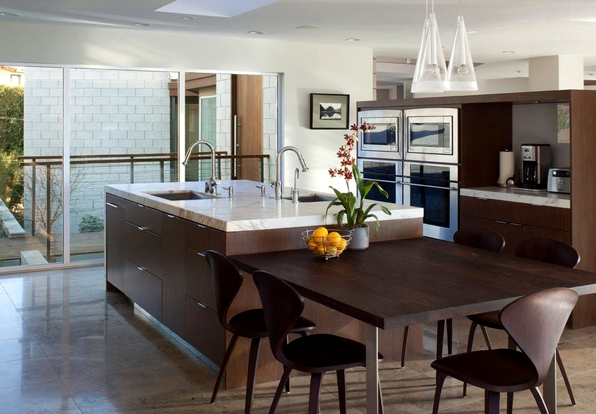 The dining area can be illuminated with a chandelier, ceiling lights or wall sconces. It is advisable to arrange the latter option when placing the table near the wall. For a good level of lighting, it is better to give preference to models in which the plafond to the kitchen is at some distance from the wall and provides a direction of the light flux from top to bottom.