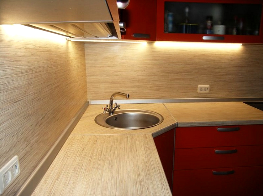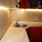 There are several options for organizing lighting above the work surface in the kitchen: spotlights, fluorescent lamps and LED strips. Each of them has its own distinctive advantages and disadvantages.