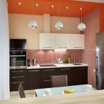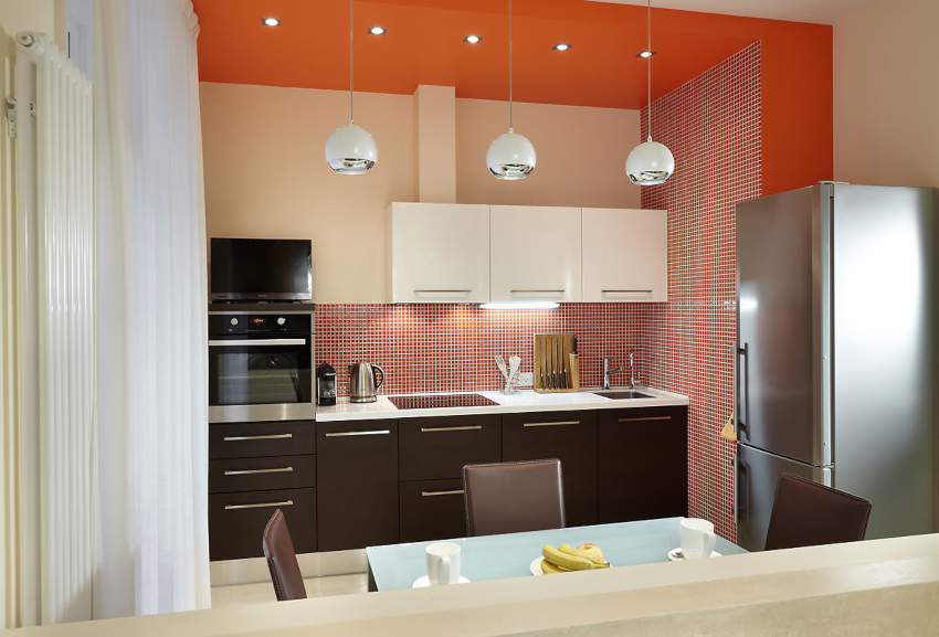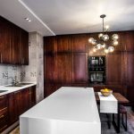 A good effect is created by LED lamps that do not form shadows. This lighting option is able to correct the unfortunate shape of the room. When the same elements are located on one side of a narrow kitchen, the room becomes wider. To visually narrow the kitchen, LEDs are mounted along the middle ceiling line. For maximum convenience, you can purchase LED lamps with a built-in motion sensor, thanks to which the light will turn on if someone enters the room and turn off when someone is absent from the kitchen.