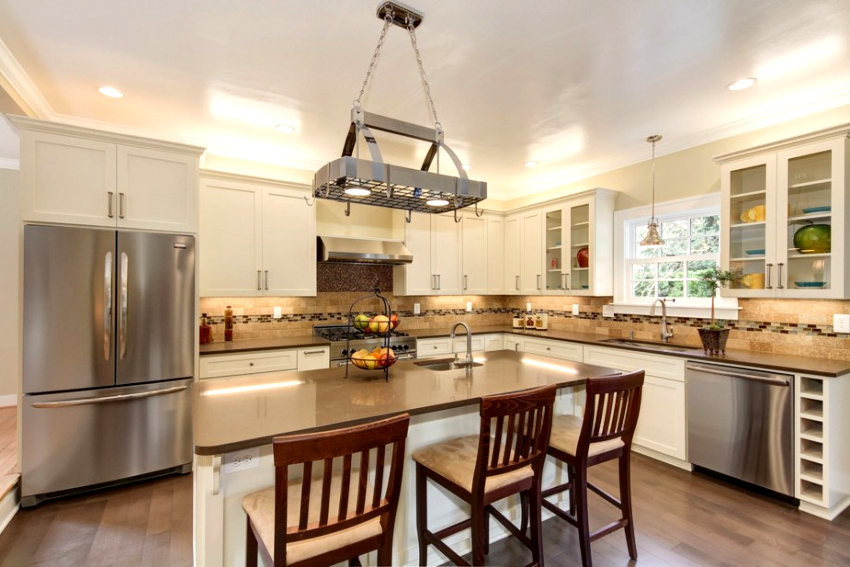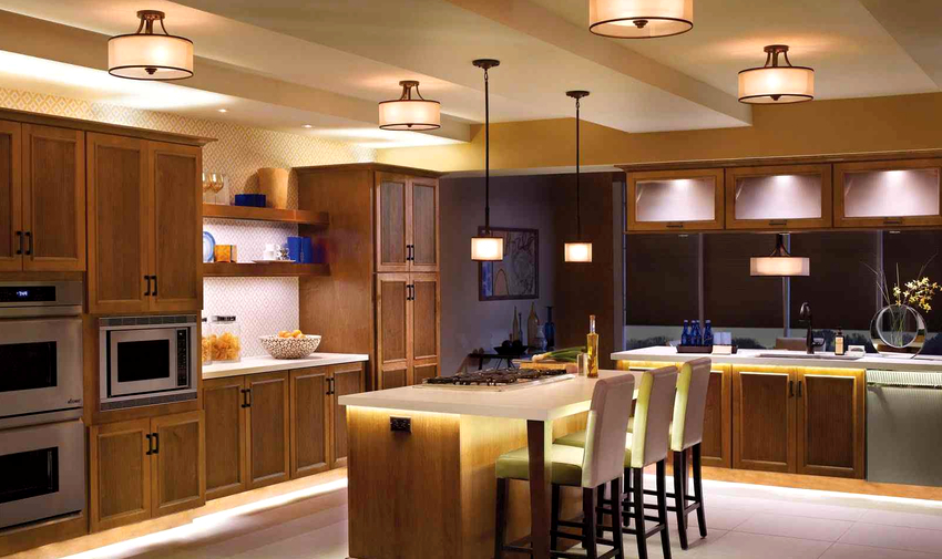 What should be in the kitchen for a comfortable stay indoors in the evening? First of all, lighting must be properly organized. A competent approach involves the use of several options for lighting fixtures that create multi-level lighting. Thus, it will be possible to illuminate each functional area.