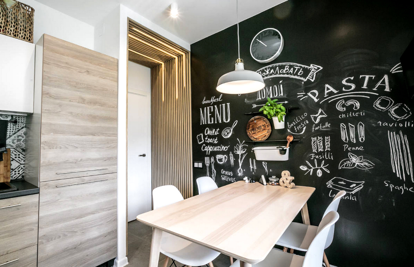 A neon sign can be placed on the wall near the dining table, which will give the room an original appearance. With its help, you can emphasize the romance of the atmosphere during dinner or revive it during gatherings with friends.