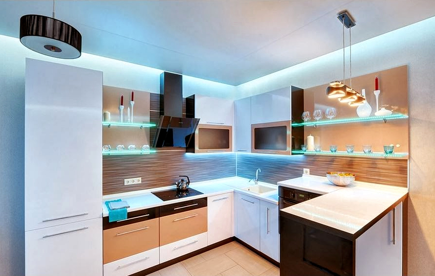 A popular and effective solution is the use of LED lighting in the kitchen. This option is characterized by practicality, which is especially important for rooms with high levels of humidity and temperature fluctuations, durability, low energy consumption, resistance to voltage surges in the network and affordable cost.