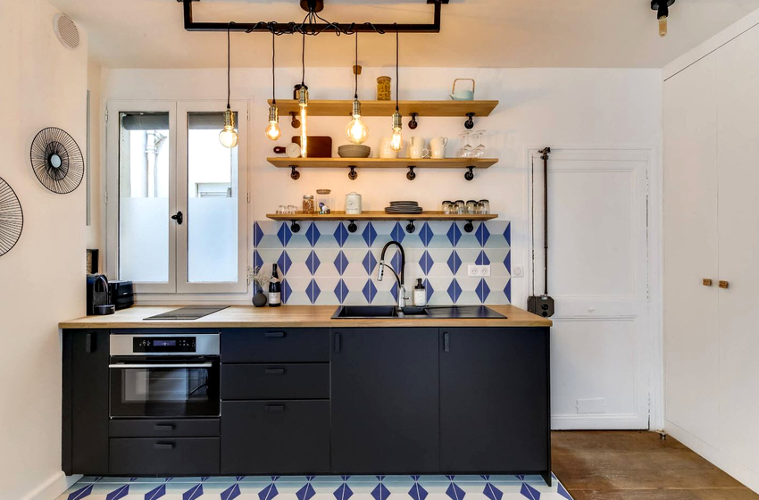Lighting in a small studio kitchen does not involve the use of a large number of powerful lamps, which will create too bright light. Volumetric lighting fixtures are also inappropriate. In this case, the most correct solution would be to use built-in LED lamps, small wall sconces and spotlights. All light sources must provide diffused light, due to which the effect of expanding the space will be created.