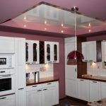 Lighting in a kitchen with a stretch ceiling can be organized by using any version of a pendant chandelier, in which the shades are directed downward or to the sides. Spotlights and spots of any configuration look good. They can overlap or crash into the harness. As for the overhead lamps for the kitchen, in this case it is appropriate to install appliances with reflectors.