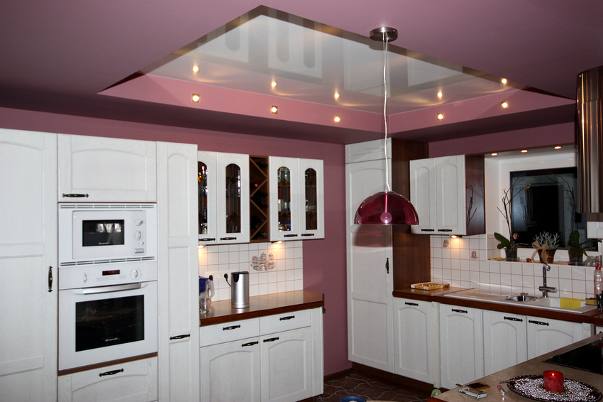 The best element of a room for decoration is a suspended multi-level ceiling. Light sources can be placed in curly niches, at the joints of individual structural elements or along the perimeter of the ceiling. For lighting the ceiling in the kitchen in the case of a multi-level structure, illuminated spotlights are a suitable solution.