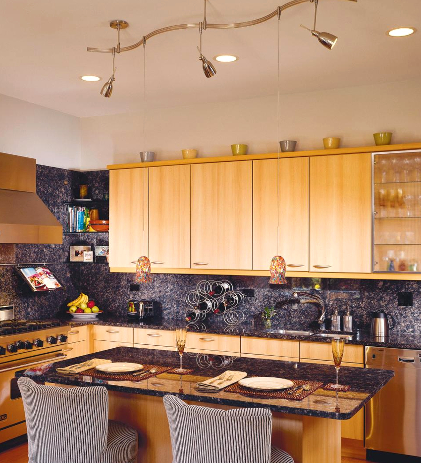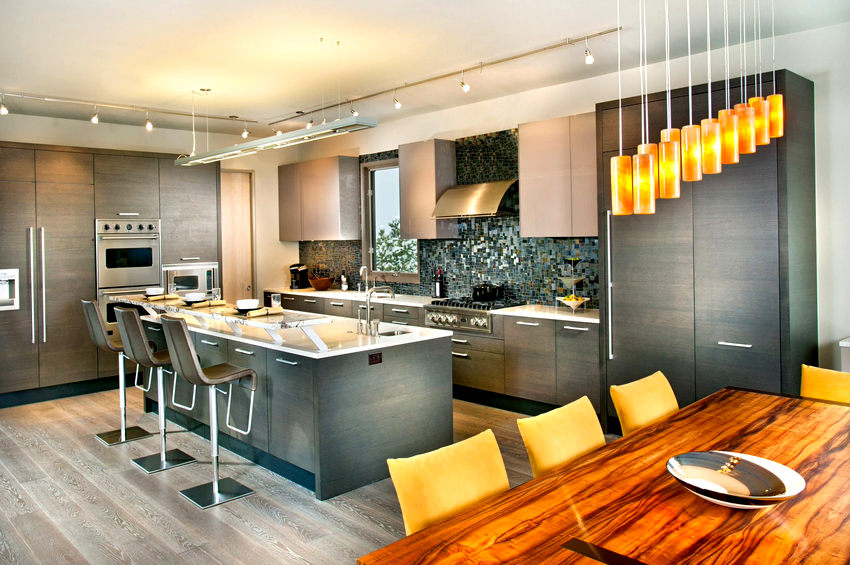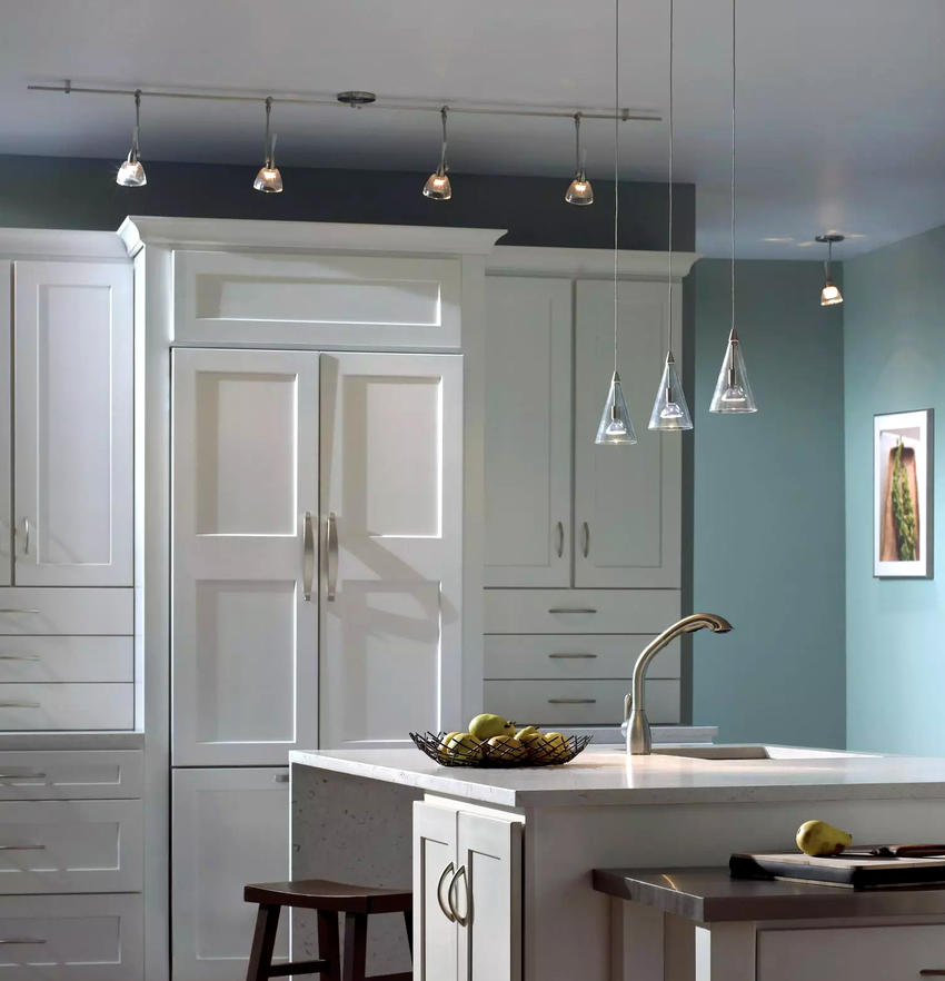Ceiling lamps on rails are a good solution for the kitchen, which makes it possible to turn the appliance in any direction.