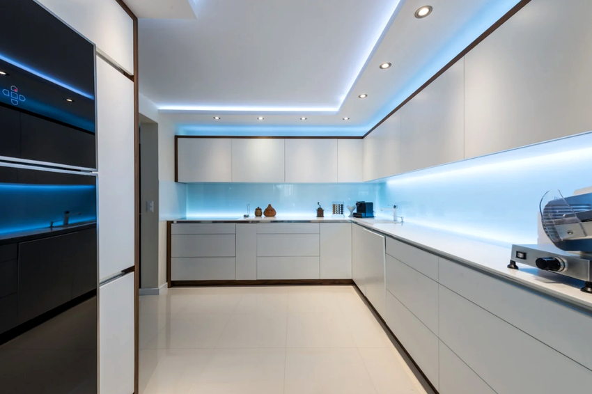 By placing the LED strip under the countertop, you can create a beautiful night illumination of the kitchen furniture set, as if floating in the air. The illumination of the front of the kitchen island or peninsula looks impressive and stylish.