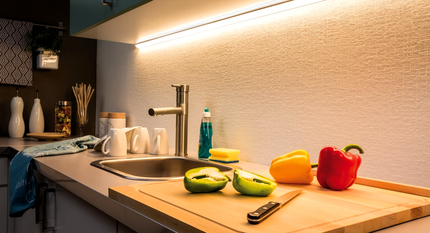 However, the organization of lighting for the working area in the kitchen at the bottom of the wall cabinets creates two problems: an unsightly appearance and discomfort from bright light for those sitting at the table. Both issues can be solved with a decorative strip that will cover the lamp and limit the light, making the lighting softer.