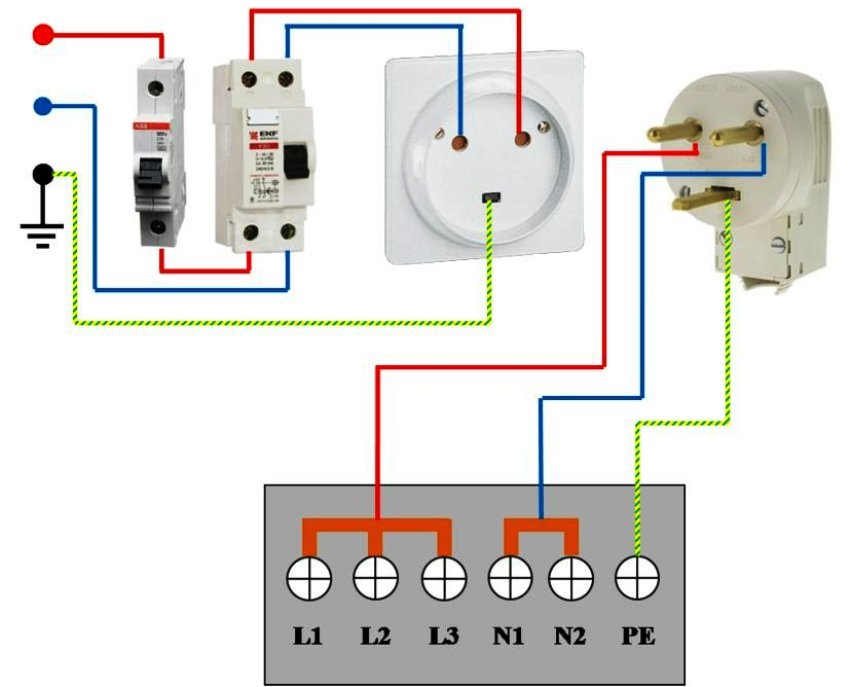 With a three-phase network, the neutral (zero) is connected at the top, and the ground, on the contrary, is at the bottom. In turn, the wires representing the phases are located in the middle. This order must also be followed at the outlet.