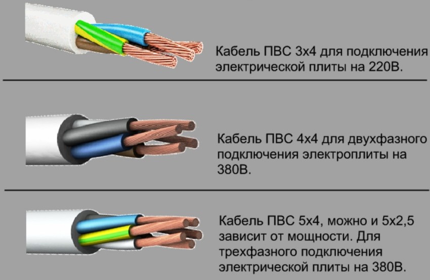 The number of cores in the cable is selected depending on how many contacts are in the terminal block of the connected electrical device. Cooking surfaces, as a rule, have only two connection options - to 3 or 4 conductors. A stove cable containing 3 cores is usually used when it is necessary to connect a cooking surface to a single-phase network. In such a system, the voltage is 200 V.