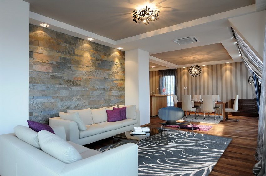 Reception of the arrangement of central lighting with point recessed ceiling LED lamps (photo examples illustrate this) allows you to achieve high-quality illumination of the entire room and place light accents on individual decorative elements. The combination of several types of lighting, operating in different modes, significantly saves energy costs.