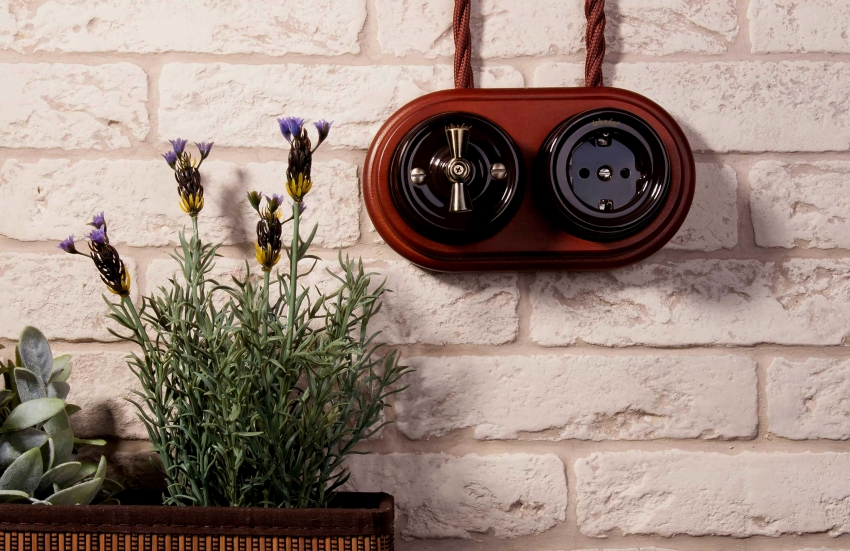 The retro switches and sockets produced by this Swedish company deserve special attention. These mechanisms are ideal for creating sophisticated accents on brickwork, wood walls and other materials.