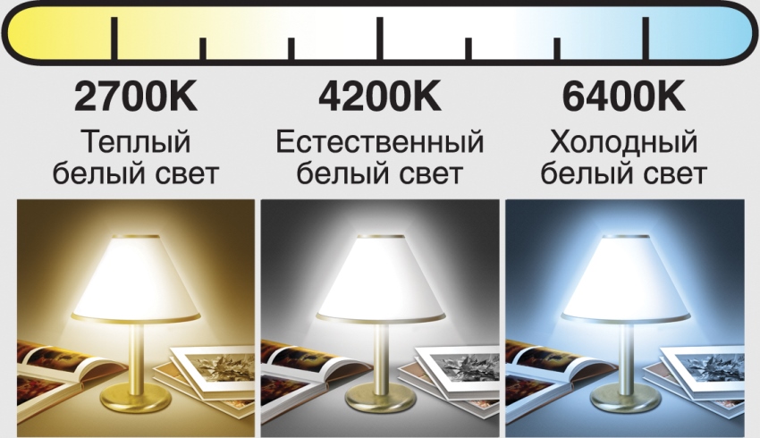 When choosing a lamp, you should pay attention to the color temperature, which determines the spectral composition of the light source. Elements with values of 4000-4500 K are popular for most rooms. For an apartment, you should choose lamps that create warm light with a value of 2700-3500 K, cold tones with a temperature of 4000-4500K will be convenient for reading.