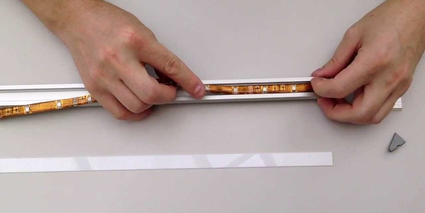 Separately, it is worth considering the case when it comes to installing a high-power LED strip. In this case, for greater aesthetics, the tape is laid in a profile. First of all, laying is done, and only then the power leads are connected. After that, the tape must be fixed with the same double-sided tape, and the profile itself must be fixed on the cabinet.