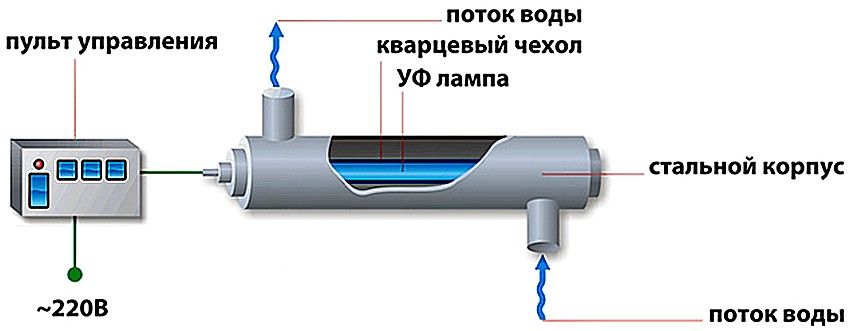 UV filters for water disinfection are a reservoir, a lamp and a nozzle. When liquid enters the container, the lamp turns on and the water is treated with ultraviolet light. The purified liquid enters the outside through pipes. It is the lamp that is responsible for the destruction of microorganisms that pose a danger to human health. Under the influence of rays, the chromosomes of harmful microorganisms are destroyed.