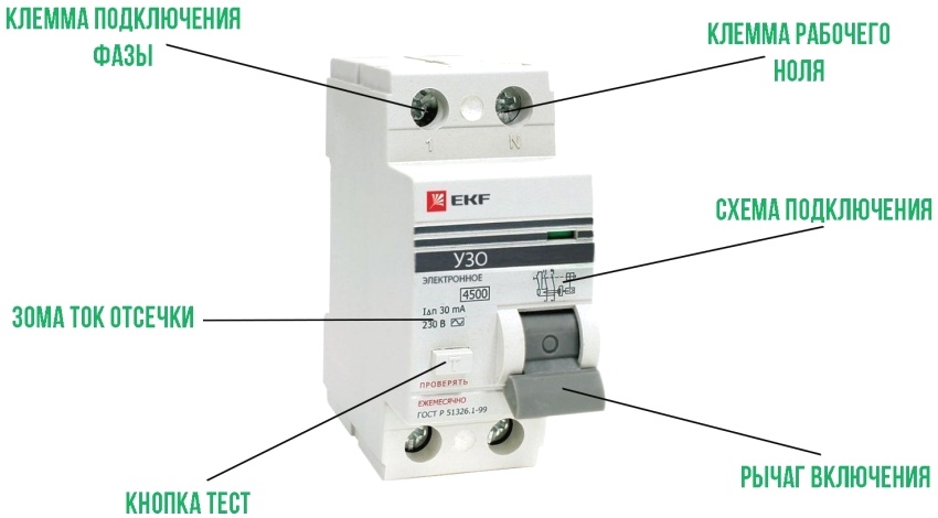 To perform its protection function, the device consists of a differential current transformer minimized in size, a control "tracking" magnetoelectric relay, a control solenoid for the main contact group and additional diagnostic elements - the "Test" button and elements of actuation mechanisms.