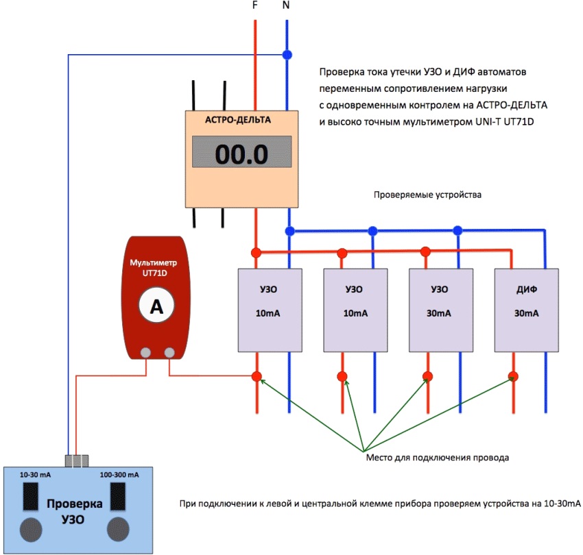 Useful advice! When connecting a four-pole. those. three-phase RCD into a similar network, it is necessary to strictly comply with the phase marking with the marking terminals of the device. Otherwise, the test mode will not be objective.