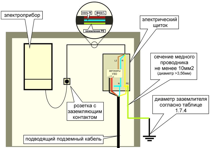 The main purpose of the ground loop device is to exclude the possibility of electric shock to a person or an animal in case of touching the body or part of the electrical equipment mechanism, which is energized due to a phase electric current short circuit on them.