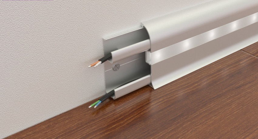 First you need to fix the skirting boards. If the voids of these elements are used as a conduit for wiring, then they must be indicated in the diagram before starting direct work. At the second stage, it is required to lay boxes from the baseboards to electrical appliances (sockets, switches). Next, the cables are pulled through them.