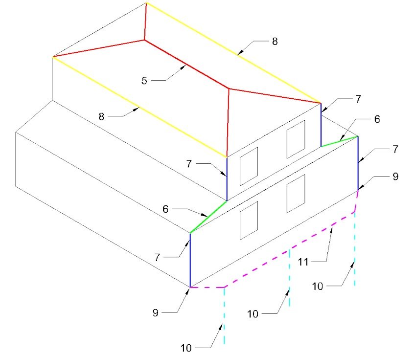 Lightning protection system layout. The numbers indicate the locations of the current leads. Dotted lines show grounding elements connected to lightning protection current leads