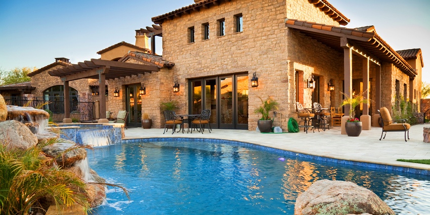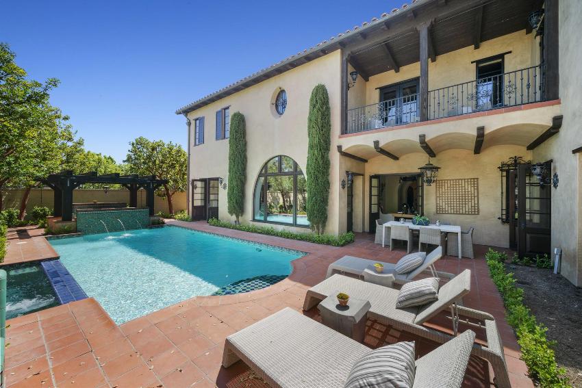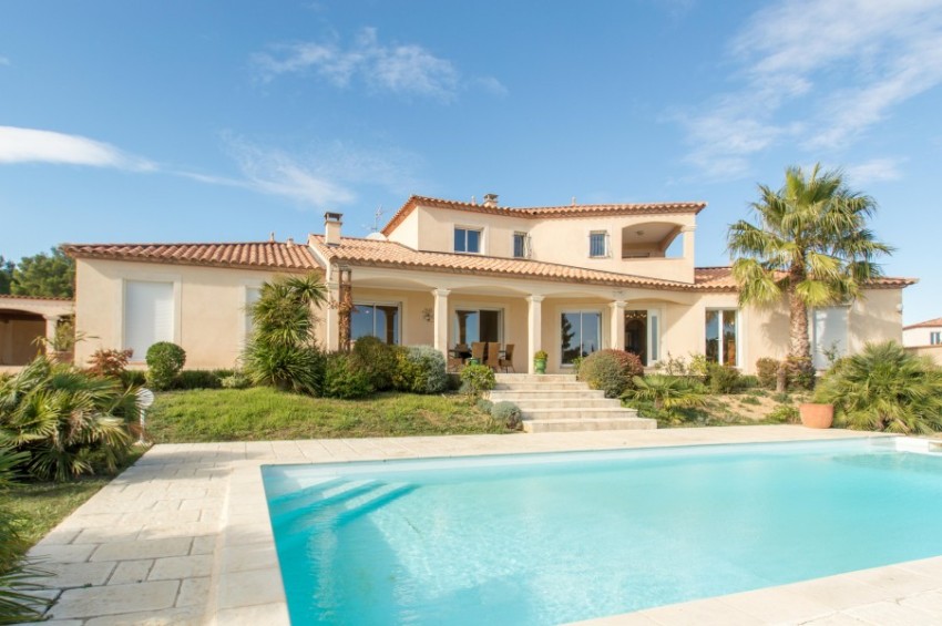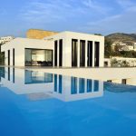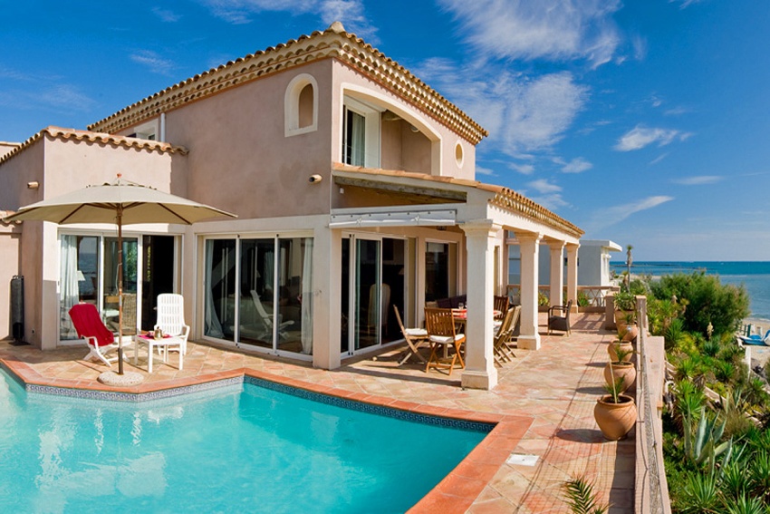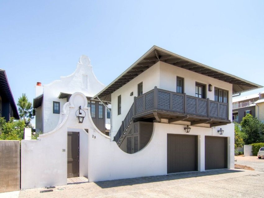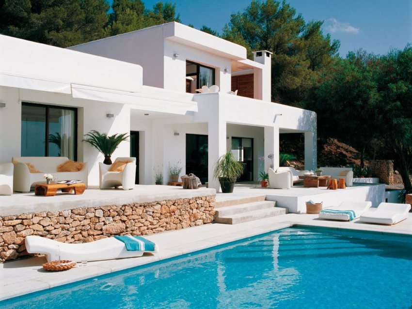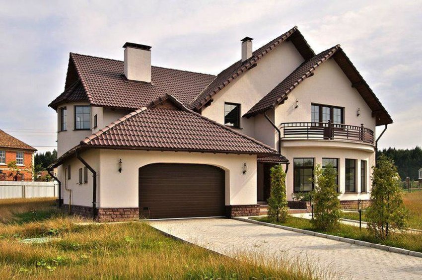 Often, in the design of facades, Mediterranean motives are used, providing for the use of warm colors on the facade. In addition to the main windows, it is acceptable to make a number of small windows on the facade, giving the building an infinity effect. Such houses often have semicircular balconies, niches and other elements. In this case, the external walls are mainly finished with various plaster mixtures.