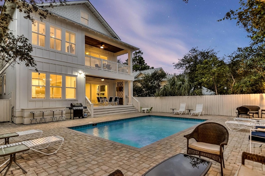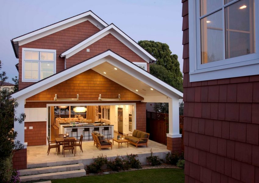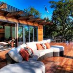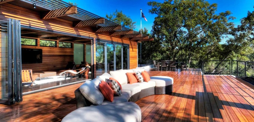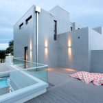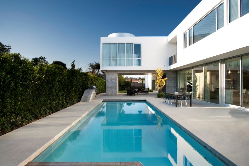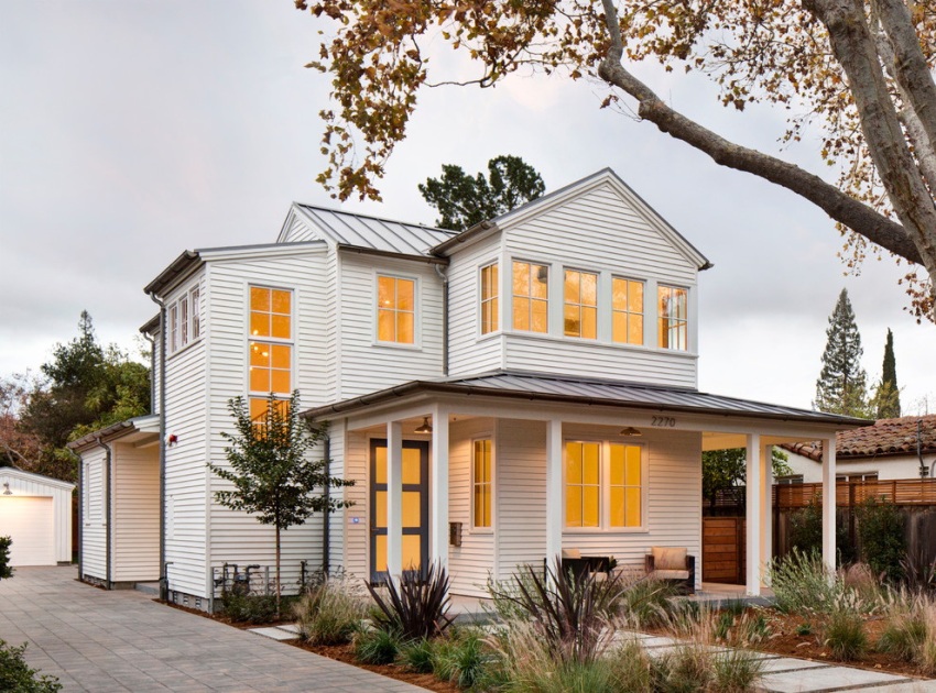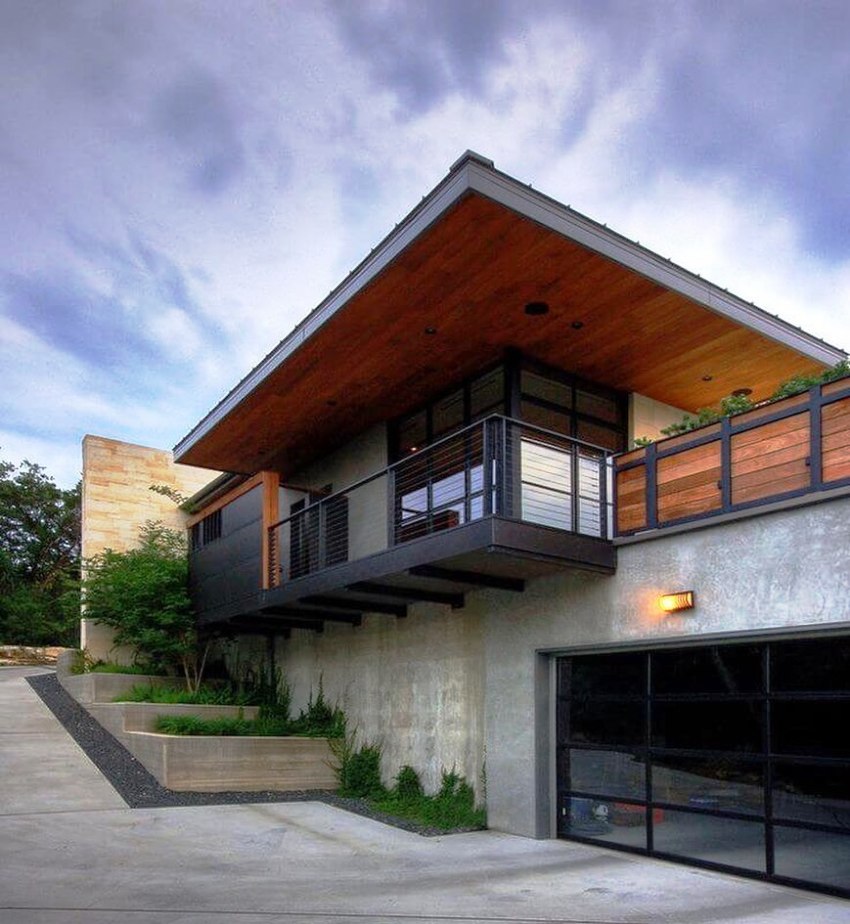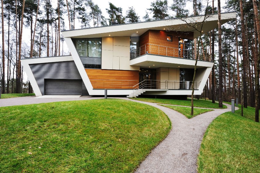 The high-tech style is somewhat close to minimalism, it also presupposes clear lines and regular geometric shapes. You can often see the use of white or gray metal siding, but plastered facades in the same color scheme are also popular. It is important when creating a high-tech design to equip the house with functional engineering items that will also play the role of decor. These can be large windows of the correct geometric shape, even better round ones, which with the help of the remote control completely disperse to the sides, or unusual doors.