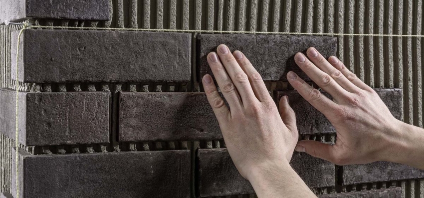 Now we proceed directly to the installation of the tiles. Laying should begin from the corner of the building, first fixing the corner element. To do this, use a notched trowel to cover the base with a layer of glue. The thickness of the mixture to be applied is approximately equal to the thickness of the tiles. Each new piece of cladding is pressed against the wall and sealed with a mallet. Excess adhesive, squeezed out into the inter-seam space, is removed. To ensure uniform gaps between the tiles (10-14 mm), you should install mounting crosses or a round rod with a diameter of 6-8 mm. The horizontal and vertical position must be checked every 2-3 rows.