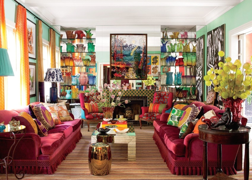 In terms of color scheme, the recommended colors are red, green, yellow, blue. The presence of a large number of shades is a mandatory attribute of this style. It is advisable to put fresh flowers in vases in the house.