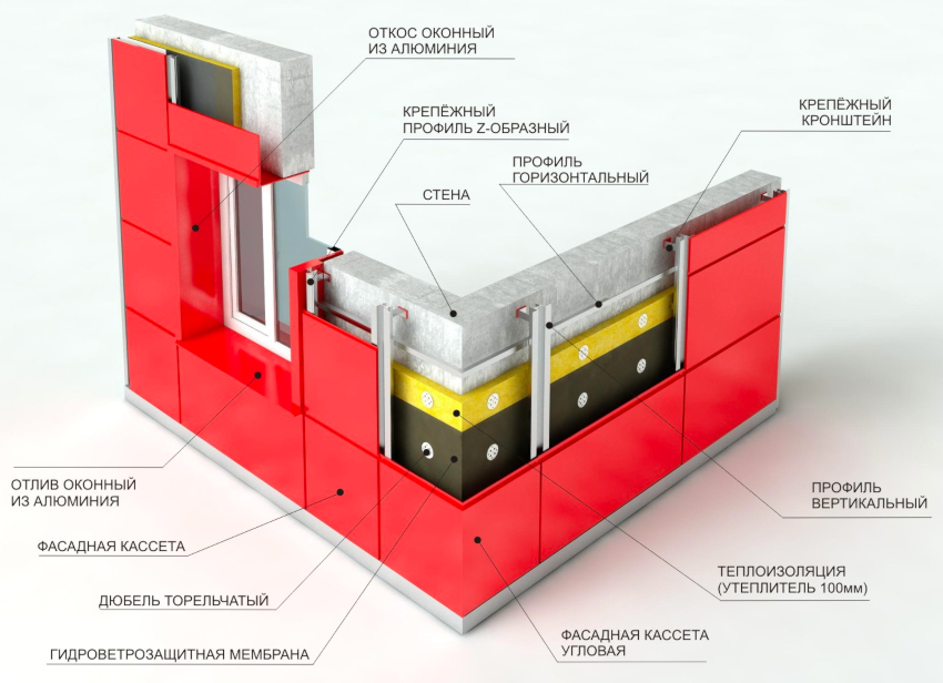 The ventilated façade system is a multi-layer structure, which is attached to the outer part of the building wall using profiles and bolts