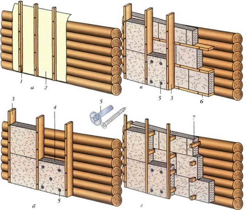 Wall insulation: a - rolled insulation, b - interframe in one layer, c - interframe in two layers, d - frameless in two layers; 1 - lathing, 2 - rolled insulation, 3 - vertical frame, 4 - slab insulation, 5 - fungus, 6 - horizontal frame, 7 - shorties
