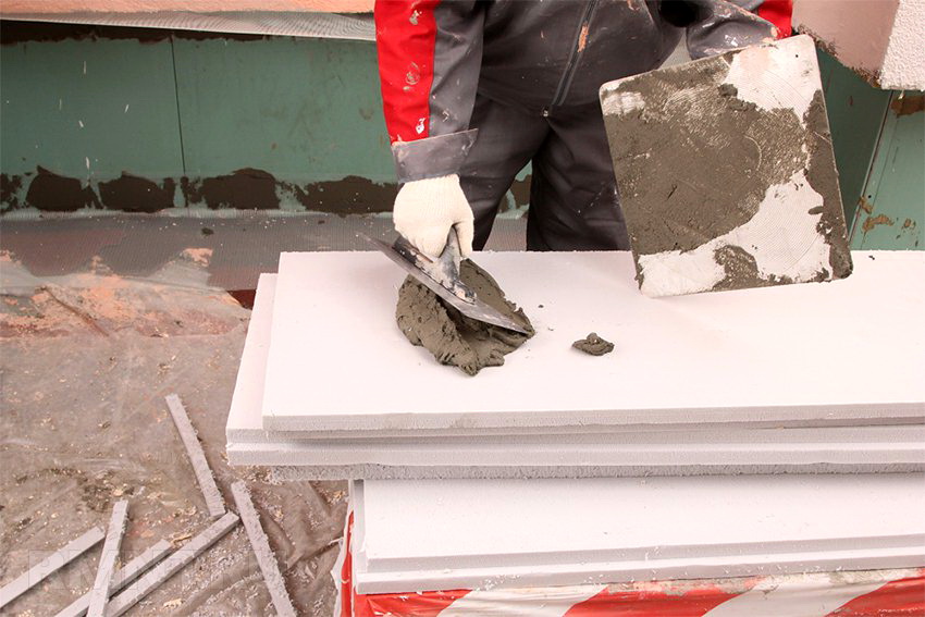 The technology of facade insulation with penoplex provides that the elements are fastened with a special adhesive mixture. It is prepared according to the instructions that come with it. It is important to use the prepared amount of solution within 1.5 hours if the ambient temperature is not too high. In hot weather, this period is reduced to 40-60 minutes.