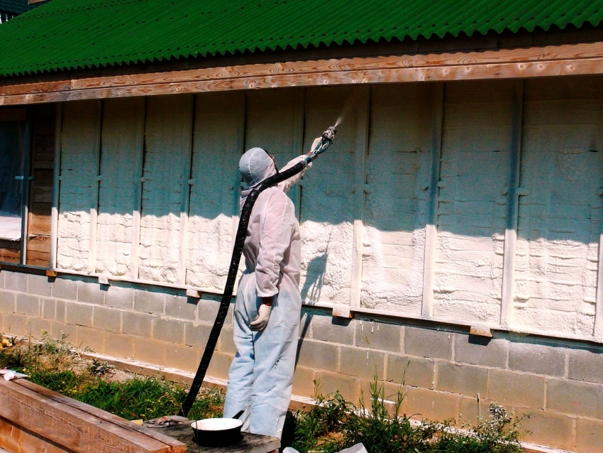 The application of polyurethane foam to the exterior walls of the house is as follows: