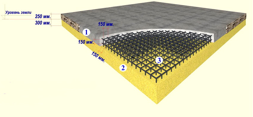 In the first case, the laying technology includes the traditional sequence of actions, without any changes.Classical pouring of a slab with internal reinforcement is made on a sand and gravel lining.