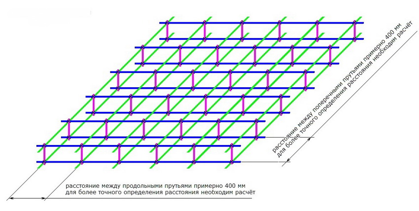 At the next stage of calculating a monolithic foundation, the number of necessary reinforcement is calculated, which will be required to stiffen the concrete slab. It is important to remember that the reinforcement mesh is laid in 2 layers. The distance between them should not exceed 5 cm.