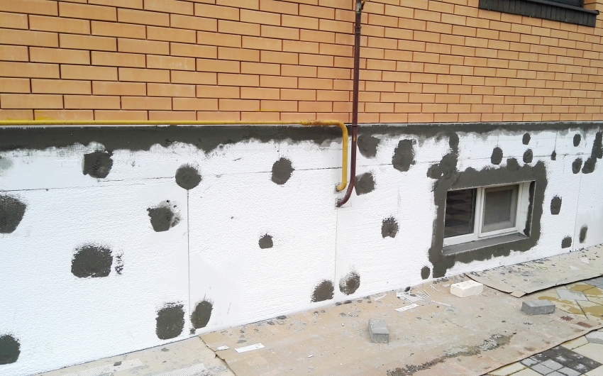 Work begins with insulation of the underground part of the foundation. For this purpose, PPS boards are attached using a specialized contact adhesive, which is applied around the perimeter of the product and in the center. The second level should be laid with a spacing of the joints between the plates in relation to the lower level. After installation, all gaps are filled with polyurethane foam.