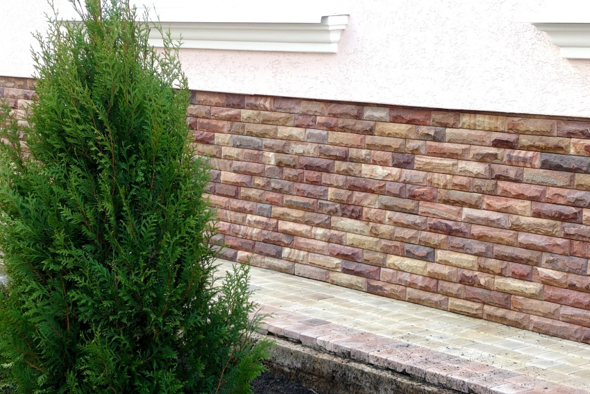 An alternative to expensive natural material is the use of artificial stone for the base. This material is produced in the form of concrete slabs, the surface decorative layer of which imitates natural stone. Thanks to modern technologies, a durable, reliable, frost-resistant and moisture-resistant facing stone for a basement is obtained, which, in comparison with natural stone, has less weight and a more affordable price.