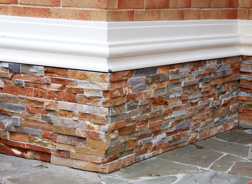 To decorate the base with artificial stone, you should choose a material of more than three matching colors, which will look more like natural stone. To obtain a uniform masonry, large elements should be interspersed with small ones, rough ones with smooth ones.