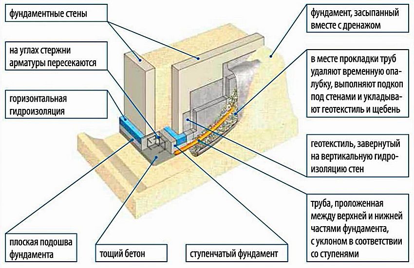 The second method is more versatile. A trench is also dug around the perimeter of the house, holes are drilled at the base of the foundation where metal pins are inserted. Then the trench is partially covered with crushed stone, and the pins are connected by welding using metal beams. The resulting reinforcing structure is poured with concrete.