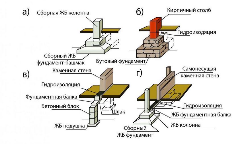 Installation of a columnar foundation made of various materials: monolithic reinforced concrete, rubble stone, concrete blocks and precast concrete