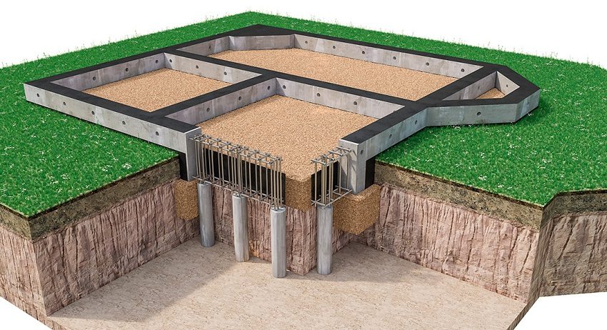 This type of foundation has a characteristic concrete base structure. A beam is fixed in it, which is poured out of concrete and reinforced with reinforced elements. This is a single system consisting of supports (piles) and a grillage.