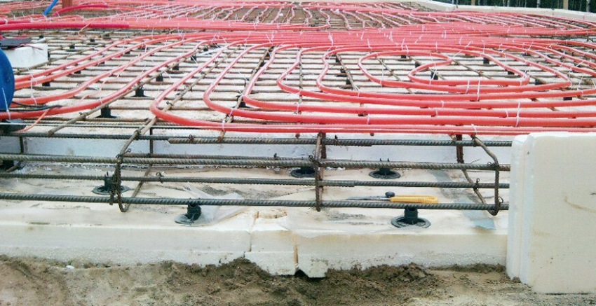 The technology of the Swedish insulated slab involves the installation of a warm floor in the thickness of a monolithic foundation. The underfloor heating contour is laid on the upper mesh and is attached with nylon clamps. In this regard, the thickness of the upper concrete cover should be taken into account, which should be 50-70 mm. In places where load-bearing walls or doorways are located, pipes should be placed in sleeves made of durable material. There must be a distance of at least 10 cm between the pipes.